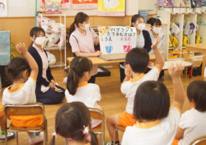 「今日は0歳児から6歳児までを対象に行いましたが、歯を磨くときに使う歯ブラシのサイズや歯磨き粉(フッ素)の量まで考慮した歯磨き指導をしました。指導中、子どもたちは体を私たちに向けて、しっかり聞いてくれました」と話していた。