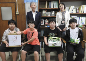 佐藤一樹児童会長(12)が「カボスとジュースをありがとうございます。カボスは酸味があるので、よく焼き魚にかけて食べています。全国1位なので、これからも積極的に食べたいです」とお礼を述べた。