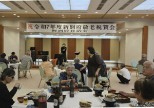 新別府自治会(伊藤敏幸会長)は、令和7年度敬老祝賀会を27日午前11時、ホテル別府パストラルで開催。49人が参加した。