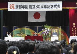 学校法人溝部学園(溝部仁理事長)は、創立80周年記念式典を3日午前9時半、高校の体育館で開催した。現地やオンラインなどで約1400人が参加した。