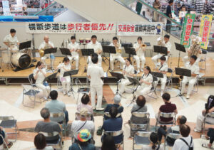 別府警察署は「秋の全国交通安全運動に伴う啓発活動」を9月27日午後1時から、ゆめタウン別府1階ゆめ広場で開催し、多くの来店客が足を止めて参加した。