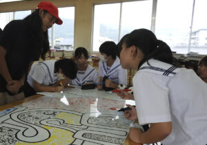 日出町の観光親善大使を務めるRyuAmbeさんが3日、町立日出中学校(深町勝幸校長、662人)で「文化祭テーマ『QUEST~探求する~』を絵がこう」と題して、中学生と一緒に壁画づくりに取り組んだ。