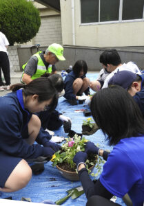 玄関前にブルーシートを敷いて、6班に分かれてプランターにパンジーなどを植えた。長方形のプランターには、同じ種類の花を等間隔に植え、丸いプランターには班ごとに好きなように配置して植えた。