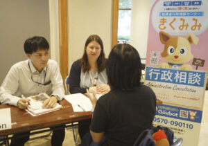 学生や教職員から▽在留資格関係4件▽国民年金5件▽マイナンバーカード関係2件▽市税関係1件▽道路関係2件▽市政関係1件―の計15件の相談があり、丁寧に答えていた。