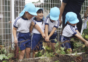 満3歳児、年少組、年中組、年長組が入れ替わりでイモ掘りを体験。イモのつるを引っ張るとき、園児は「いもほりのうた」の歌い出しの「うんとこしょ、どっこいしょ」と言いながら、小さい手でつるを引っ張るとイモが姿を現した。中には園児の手より大きなイモも収穫した。その後、園児は「モグラの手」で掘り返しながら土の中のイモを掘り出した。多くのイモを収穫した園児は、組ごとに集まってイモを持ち、「いっぱい穫れたよ」と言いながら記念撮影をしていた。