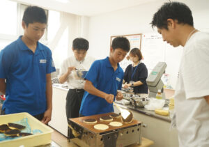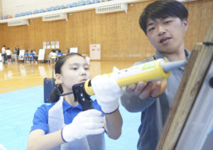 参加企業と体験内容は▽(株)板井装飾=クロス貼り、フロアタイル貼り、カーペットタイル貼り▽(有)大分ルーフテック=シーリング実技体験▽(株)和田組=住宅パズルを使った間取り作成体験、(株)後藤工務店=住宅VR体験、三光建設工業(株)=CADによる3D体験▽(株)森工機=配管実技体験▽高崎建材(株)=左官・タイル貼り体験▽(有)大倉菓機=どら焼き体験(どら焼き機とホットプレートの違い)▽(有)秋吉タタミ店、(有)佐藤たたみ工房、長門一磨タタミ総本山=ミニ畳作成体験―で、生徒は男女混合で7班(1班6人)で順番に体験していった。