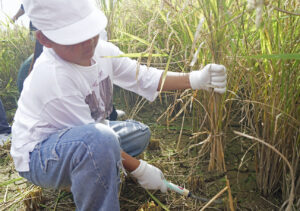 恒松会長が刈り方を説明し、同会員が指導する中、園児は小さい手で、児童はしっかりと1株をつかんで日ごろ使うことのない鎌を使って、計2株を刈り取った。その後、別府溝部学園短期大学幼児教育科30人に手渡し、1束にして麻紐で結んだ。