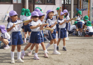 グラウンドに移動し、園児は水を補充し人がいない方向に思い思いに水を飛ばしていた。最後に男女別で並び、誰が遠くまで水を飛ばせるかを競った。