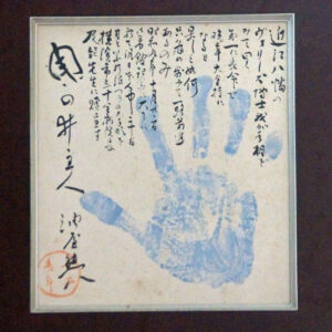 両親が亀の井バスで働いていたという生嶋光生さん(別府史談会会員)にこのほど、別府市内の友人から額装された油屋熊八翁の手形が寄贈された。