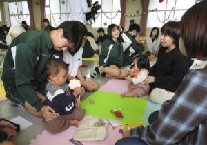 市内在住の主婦糸永愛さん(34)は昨年に続いて陽愛さん(1)を連れて参加。「昨年参加した時に、高校生がいろいろと準備をしてくれて楽しかったので、また参加しました。高校生からは、子育てで意識していることを聞かれ、『怒りたくなっても感情的にならずに、優しく接している』と答えました、お互いに良い機会になったと思います」。鶴高の小屋奏真さん(16)は「自分には年の離れた弟がいて、弟が小さかった時のことを思い出しました。これまで小さい子はちょっと苦手な部分もありましたが、触れ合って、可愛いなと思いました。抱っこをすると、温かくで柔らかかった」と話した。