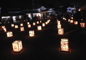 大原邸と一松邸では、江戸千家によるお茶会が行われ、そこに続く石畳の坂道や武家屋敷に約8千本の行燈や竹灯篭が並び、幻想的な雰囲気に。市立杵築幼稚園入口には、園児たちが作った行燈を、市役所公用車駐車場には市立杵築小学校5年生の行燈、放課後児童クラブの作品も並び、写真を撮る保護者の姿が多くみられた。酢屋の坂はズラリと行燈が並び、坂道を照らし出した。