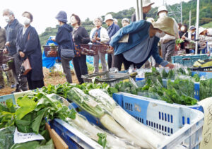 農産物としてサトイモ、レタス、春菊、カボス、ゴーヤ、ナスなどが並び、多くの人が真剣に選びながら購入していた。棚田米の試食としておにぎり150人分が配布され、受け取った来場者は「甘い」「光沢が違う」「歯ごたえが違う」と言いながら、笑顔で食べていた。焼きイモの販売もあり、熱せられたアルミホイルを丁寧にはがしながら、ホクホクの焼きイモを頬張っていた。