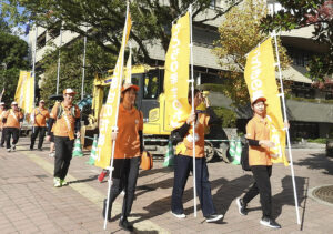 その後、のぼりを持って市役所を出発。大分県庁まで約14㌔㍍をみんなで歩いた。