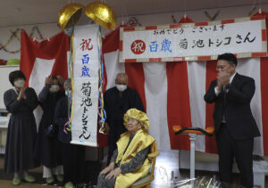 長野市長が表彰状とお祝い金などを手渡して「いつまでも元気でいてください」と声をかけた。菊池さんは「元気で生きてこられたことを、喜んでいます。皆さんのおかげ。多くの皆さんにお祝いをしてもらって、ありがとうございます。これからもよろしくお願いします」とお礼を述べた。