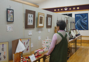 公民館1階大ホールでは展示会があり、各教室や個人愛好家らが竹細工、着物、パッチワーク、写真などの作品150点以上が並び、来場者が鑑賞した。また、新別府病院から看護師2人が来て無料血圧測定をした後、アドバイスなどをしていた。