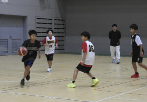 バスケ大会では、小学生と中学生各6チームが出場。1チーム3人で、バスケットコートの半分の中で、1つのゴールを使って得点を競った。攻守が素早く入れ替わり、スピード感あふれる白熱した試合が行われ、コートの外では、仲間や家族らが大きな声で声援を送った。