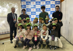 もちがはまこども園(彌田昌克園長)の園児11人(年長)らが11月25日、別府市社会福祉協議会を訪れて、「ドラえもん募金箱」19箱8855円を寄付した。