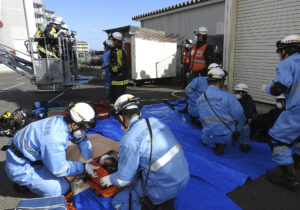 別府市消防本部(浜崎仁孝消防長)は、令和7年度集団救急事故訓練を実施。消防本部、消防署、大分DMAT(新別府病院、鶴見病院、別府医療センター、大分大学医学部附属病院)、別府市医師会立別府青山看護学生約60人が参加した。