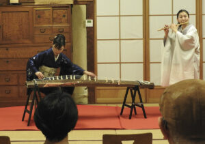 山田別荘での演奏会には、ホップウッドさんの他、篠笛のてらほしひろこさん、原千砂子さん、立花美恵子さん、笠原綾乃さんが琴で出演。諦めない気持ちを歌詞にしたアニメ「鬼滅の刃」の「竈門炭治郎のうた」をみんなで歌い、被災者へエールの気持ちを込めた。