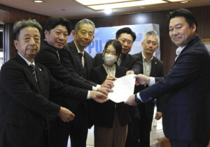 別府市旅館ホテル組合連合会(西田陽一会長)は、別府駅宿泊施設送迎車停車場設置に係る要望書を12日午後3時、別府市役所で長野恭紘別府市長に提出した。