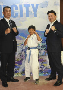 新日本空手道連盟正道会館大分支部所属の小野夏那実選手(10)が12日午後5時15分、長野恭紘別府市長に「第43回全日本空手道選手権大会」への出場を報告した。小野さんの同大会への出場は、一昨年に続いて2回目。安部和秀大分支部代表らも同席した。