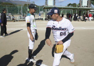 別部東ロータリークラブ主催の「学童野球教室」が11月30日、元ヤクルトスワローズの選手3人を指導者に別府市営野口原総合運動場で開催された。