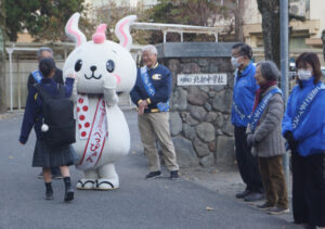 今年最後のあいさつ運動とあって、関係者の計らいで別府市宣伝部長の「べっぴょん」が特別参加した。