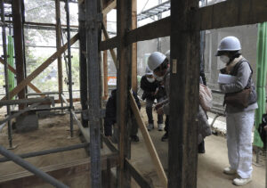 見学会では、襟江亭の歴史や調査、評価、保存工事の概要について説明。現地を実際に見て、当時の様子に思いをはせながら見て回った。また、解体部材の展示もあり、参加者は貴重な部材を興味深そうに見ていた。解体は手作業でていねいに行い、川崎工業団地北棟に保存棚を設置して格納することにしている。