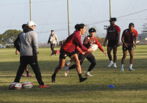 選手たちは寒さにも負けず、熱のある練習を披露。お互いにコミュニケーションを取りながら、パス練習を中心に汗を流した。セブンズは7人で試合をするため、15人制とは違ったタフさが重要になる。距離を広げながら、パス回しの練習を繰り返した。