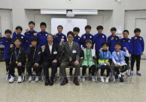 サッカー日本代表も務めた本田圭佑さんがプロデュースする「4v4JAPAN CUP2025 RESPECT YOU、au」に出場する、morochan’s(モロチャンズ)=スマイス・セレソン、Uー10=、ミネルバBLACK=別府FCミネルバ、Uー12=、ミネルバRED=同=が18日午後4時半、別府市役所を訪れて阿部万寿夫副市長らに報告をした。モロチャンズは3年連続出場で、昨年は3位だった。BLACKとREDは初出場。