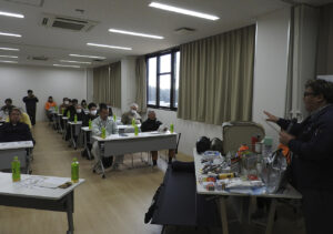 伊藤会長が「皆さんは防災士ということで、日頃からこのような研修を行うことで、防災意識をあげていってほしい」とあいさつ。来賓の長野恭紘別府市長が「細々としたことが決まっていないと、そこから混乱して受け入れどころではなくなる。フェーズごとに求められるものも変わってきます。別府市では、備蓄もバランスよくし、バーコードで管理をしています。日頃からシミュレーションをしておくことが大事」などと話し、インクルーシブ防災の取り組みなどを紹介した。