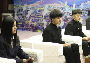第31回「全国ジュニアラグビーフットボール大会」に出場する、安岡凉久選手(別府市立中学校ラグビー部、中部中3年)、原口晃弘選手(同、青山中3年)、高浪香怜選手(別府ラグビースクール、朝日中2年)が10日午後5時15分、長野恭紘別府市長に出場報告を行った。