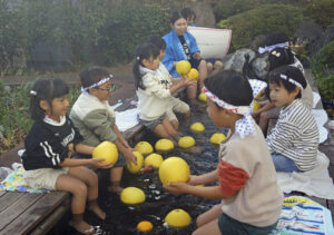 同イベントは21日から行っており、同日午前10時30分から別府大学附属幼稚園児5歳児39人が4グループに分かれて▽ざぼん・ゆず・鬼ゆずを入れた足湯体験▽南光物産(株)の協力で、ざぼん漬・ざぼんチョコレートを試食し、別府大学の別府温泉水あまざけを試飲―を行った。
