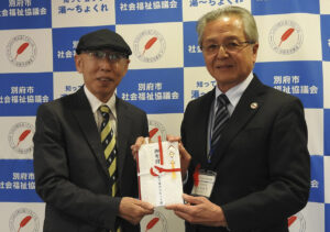 山中さんは長年にわたる寄付で今年、別府市特別功労表彰を受けた。「まだ通過点。これからも、出来るだけ頑張って寄付を続けたい」と話し、釜堀秀樹市社協常務理事に手渡した。釜堀常務理事は「毎年、ありがとうございます。困っている人たちのために使わせていただきます」とお礼を述べた。