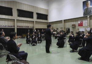 阿部社長が2年生の時に建てられ、現在も使われている練習場を42年ぶりに訪れて、後輩に「これを機会にユニフォームを新調し、よい演奏をしてもらえたらと思う。頑張ってください」とあいさつ。高橋部長が「支援をいただき、ありがとうございます。新しい衣装をつくり、応援してくれる人の気持ちに応えられるように頑張りたい」とお礼を述べ、全員で別商時代から受け継いだ吹奏楽部の代名詞「ハイスクールマーチ」を演奏し、感謝の気持ちを伝えた。