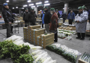 初せりでは、白ネギ、ダイコン、シイタケ、春菊といった鍋物野菜をはじめ、カブ、パプリカ、トマト、かぼすなど多くの品種が並び、威勢の良いかけ声とともに競りが行われ、次々と購入されて運び出された。