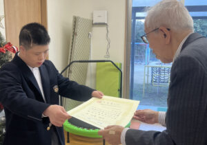 竹の内にある「こどもデイサービスにこちゃん」の利用者、永吉祐貴さんに「おおいた障がい者芸術文化支援センター長賞」が12月15日、同所で贈られた。