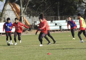 ミーティングのあと、グランドでさっそく練習をした。この日は断続的に強風が吹く中で、選手は、ランニングや早いパス回しなど基本的な練習を中心に約1時間半、しっかりと体を動かした。