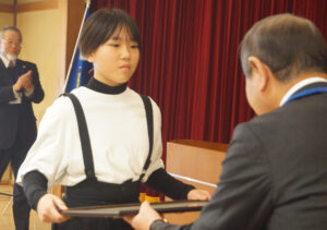 「今年度も社会を明るくする運動作文コンテストで、別府保護区より推薦した山の手小学校の後藤愛心さんが、全国第2位という大変すばらしい貴重な賞をいただきました。もう一度ここで朗読してもらい、私たちが心からのお祝いを申し上げ、表彰状授与式を行いたいます」とあいさつ。
