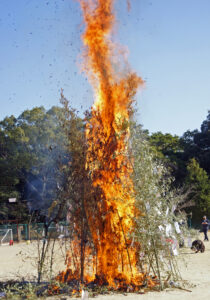 別府市南立石青少年育成協議会(中島一志会長)は「どんど焼き」を17日午前10時、市立南立石小学校で実施した。地域の人、民生委員児童委員、消防団第13分団、消防署員、地元市会議員、地元自治会長らが参加した。