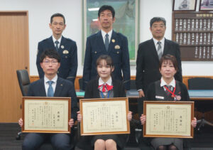 感謝状が贈呈された3人は、大分みらい信用金庫亀川支店の職員、三ケ㞍宏太さん(36)=大分市在住=、大野由惟さん(24)=別府市在住=、日本郵便株式会社別府北浜郵便局の社員、帆足和美さん(44)=大分市在住=。