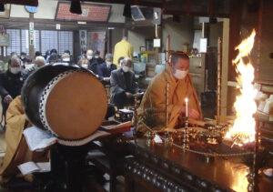 三房円瑞住職の説明では、立春のころに、一年の健康、家内安全、除災招福などの成就を祈る法要。「護摩」という作法で行われる。