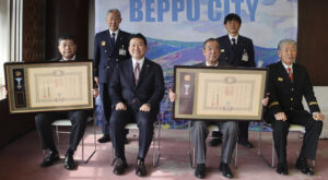 昨秋の叙勲で瑞宝単光章を元別府市消防団第8分団2部副分団長の久継孝憲氏(75)=亀川中央町、消防団歴42年1カ月=、第45回危険業務従事者叙勲で瑞宝双光章を元別府市消防次長兼予防課長の長野國憲氏(70)=火売、消防歴42年=が受章し、2人が27日午前11時15分、長野恭紘別府市長を訪問した。