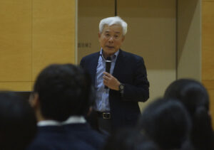 「地域の色・自分の色」研究会(照山龍治代表)は海洋研究開発機構(JAMSTEC)が保有・運用する水深6500㍍まで潜航可能な有人潜水調査船「しんかい6500」の初代船長、田代省三さんを招いて特別授業を1月26日午後1時30分、別府西中学校体育館で開催し、2年生約120人が参加した。
