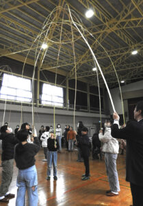 引き続き、東京都出身で、別府市の清島アパートに居住したこともある、藝術探検家・野口竜平さんが講演。「不思議なものを見ると、いろんな想像がはたらいて、ストーリーが生まれる。タコはとても不思議な生き物だなと思った。6年ほど前に読んだ本の中にタコの最新の研究が載っていて、足8本がそれぞれ自分で考えて動いているということに衝撃を受けました」と本から受けた刺激で、「蛸みこし」が生まれた経過を話した。竹をタコにみたてて作り、8本の足を8人が持って動かすという体験型アート。子どもも大人も夢中になってタコの足の気分になって思い思いに動かして不思議な竹のタコの動きを楽しんだ。