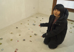 清島アパートでは、下浦萌香さんが作品1点を展示している。下浦さんは清島アパートの休憩室に滞在して、本人が案内する。部屋の中には、色が塗られた紙と県内外で見つけた石なども重ねあわせたものや、清島アパート内で発見したものなどを展示したインスタレーション(特定の空間全体を作品として構成し、鑑賞者がその中に入り込んで体験する芸術手法)を展示。紙などの作品は、用意している手袋をすれば、触ることができ、解説も聞くことができる。