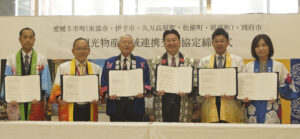 別府市と愛媛県の5市町は「観光物産広域連携交流協定」を20日午前10時、トキハ別府店1階センターモールで締結した。