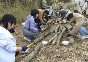 別府市緑化推進委員会(会長、長野恭紘別府市長)はこのほど、みどりの少年団しいたけ駒打ち体験を開催した。親子13人や関係者含め約20人が参加した。