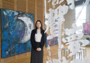 橋本さんは別府市出身、大分市在住の会社員兼アーティスト。左利きであるが、幼少期に書写教室に通い始めたことがきっかけで字を書くことだけ右利きになる。その後、高校・大学で専門的に書道を学ぶ。現在は書道のほか、絵画にも挑戦し、自分の表現の幅を広げている。初めての個展は、大学卒業個展ですべて書道の作品だった。行動大分作家展という展示会があり、知り合い伝手でオファーがあり、出品したことが本格的に絵を描き始めたきっかけ。個展は2回目だが、書道と絵画の個展は初めて。橋本さんの在廊日は、土・日曜日。