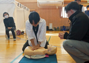研修内容や同日の流れの説明があった後、参加者は救急救命(心肺蘇生法、AEDの使い方)、竹竿と毛布を使った担架で運ぶ搬送法、煙体験を体育館内で行い、水消火器による消火体験が屋外で行われた。